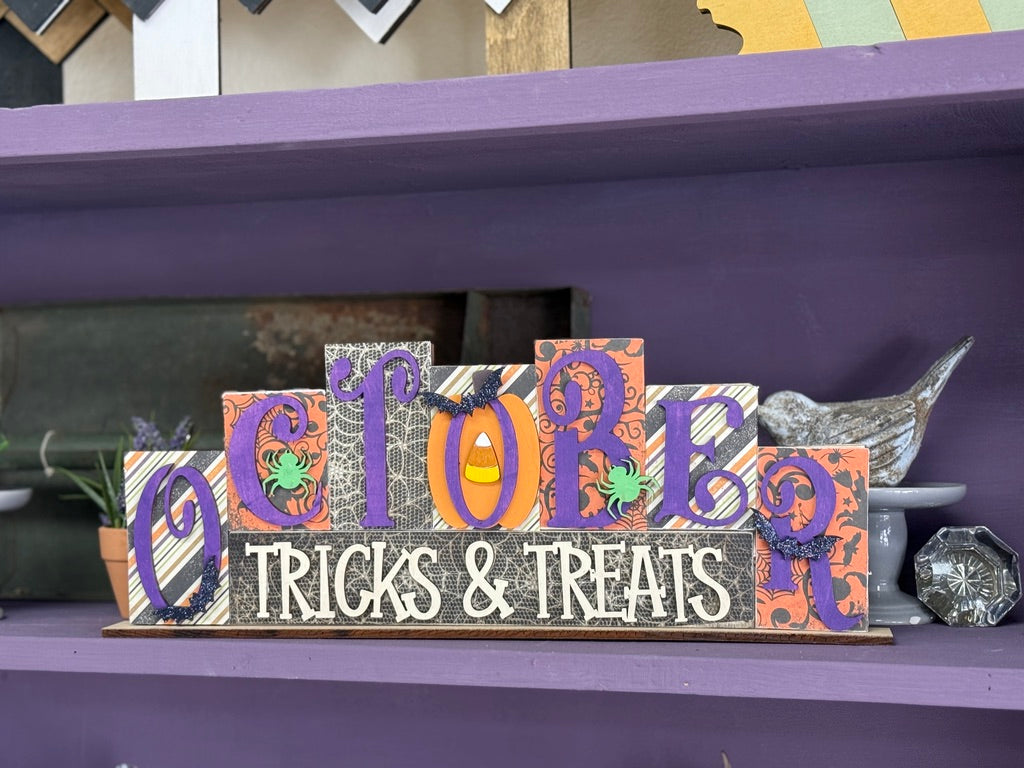 Get into the Halloween spirit with our October Shelf Sitter! This delightful DIY decor adds a fun and festive flair to your shelves. Simple to assemble and personalize, it’s a perfect way to bring some spooky cheer to your space. Made with a blend of scrapbooking paper, 3D wood accents, and sparkling glitter, it’s ready to brighten your Halloween celebrations!