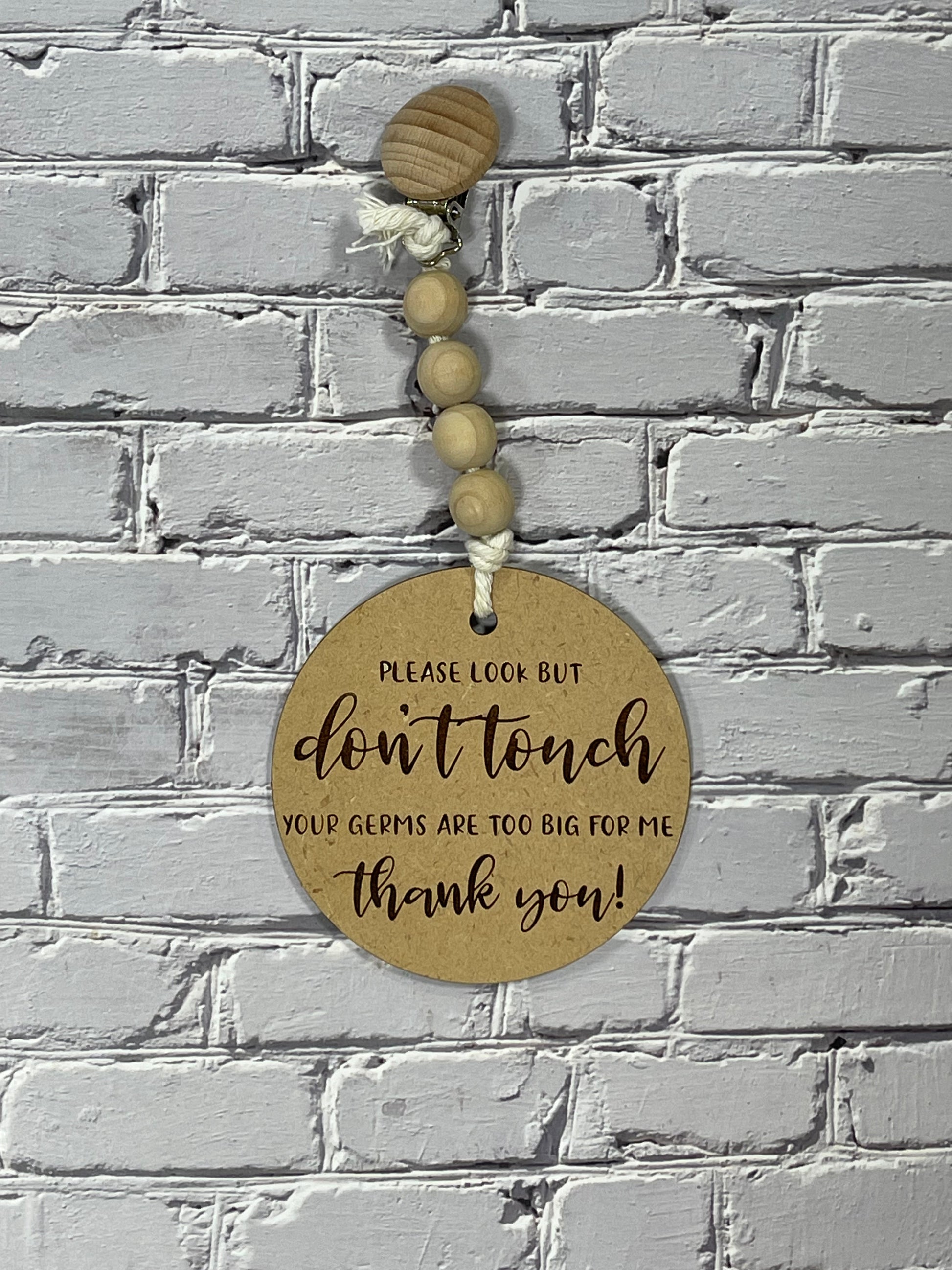 This 4-inch round car seat/stroller tag is an ideal solution for moms looking to minimize germ exposure. It conveniently attaches to strollers and car seats with the included wooden-metal clip, and features a durable string of five wood beads.